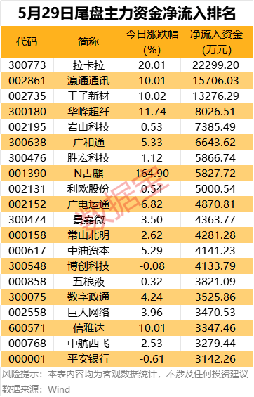 个股方面,拉卡拉(300773)、瀛通通讯(002861)、王子新材(002735)尾盘获主力资金净流入超1亿元;华峰超纤(300180)、岩山科技、广和通(300638)、胜宏科技(300476)等净流入均超5000万元。