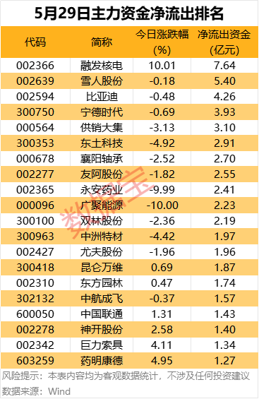 27股主力资金净流出超1亿元,其中11股净流出超2亿元。其中,融发核电主力资金净流出7.64亿元,该股目前已经连收5个涨停板,近日核电、可控核聚变概念反复活跃;雪人股份(002639)、比亚迪(002594)、宁德时代(300750)、供销大集(000564)主力资金净流出金额均超3亿元。