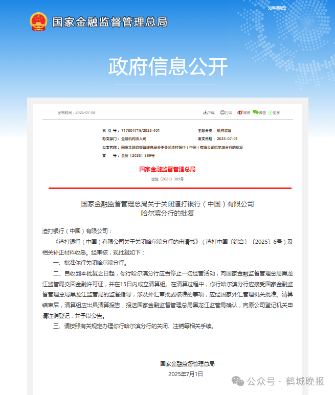 《渣打银行(中国)有限公司关于关闭哈尔滨分行的申请书》(渣打中国〔综合〕〔2025〕6号)及相关补正材料收悉。经审核,现批复如下: